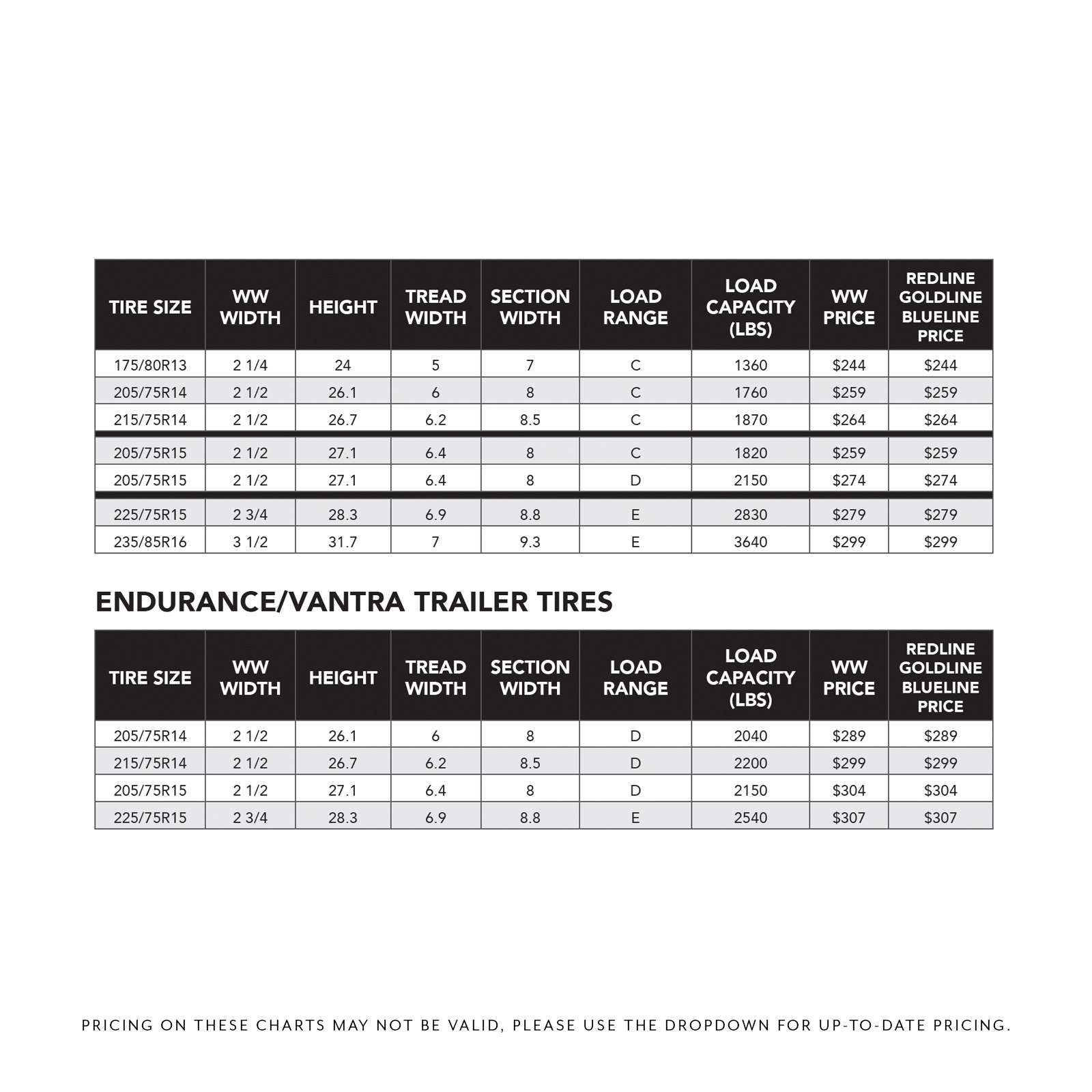 A workhorse tire that also looks the part, our Diamond Back Extra Load Trailer tires offer a true ST rated trailer tire, with a bright whitewall and longevity to match. Trailer tires are built with trailer use in mind- stiffer sidewalls to reduce sway, higher load ratings to handle the weight and wider tread widths for better load distribution. Running passenger vehicle tires on a trailer can lead to disaster! If you own a vintage trailer, or even a reproduction of a vintage trailer, be sure you have the right equipment- an ST rated trailer tire. When you want a strong, functional and beautiful tire for your trailer look no further than the Diamond Back Extra Load Trailer Tires. Call today!